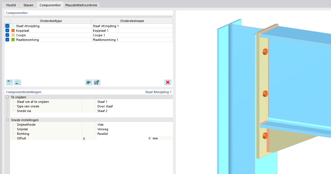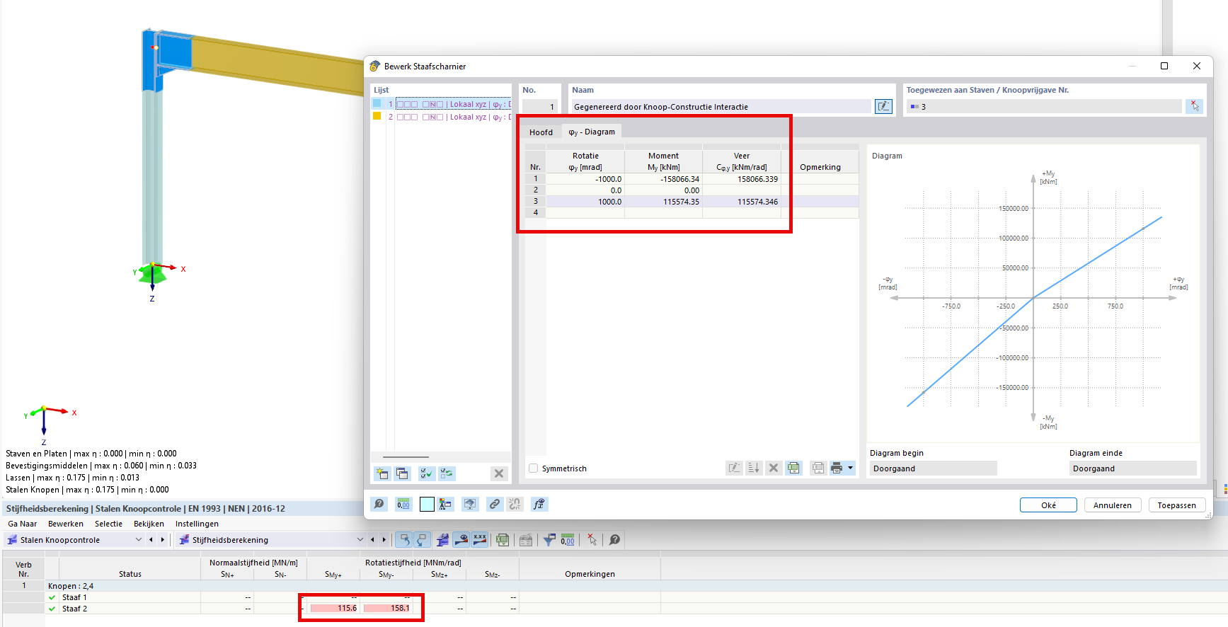 In ons voorbeeld wordt de berekende stijfheid toegepast via een staafscharnier van het type 'diagram'.